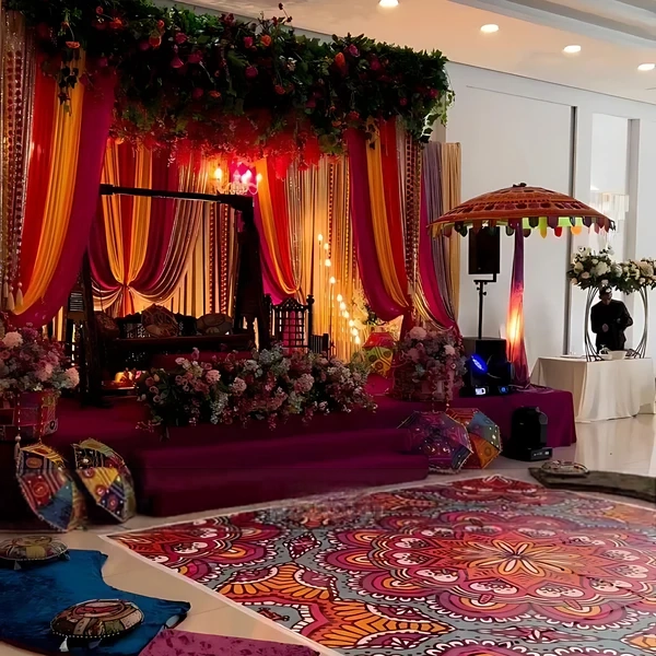 Majestic Mehndi Swing Setup with Elegant Drapes